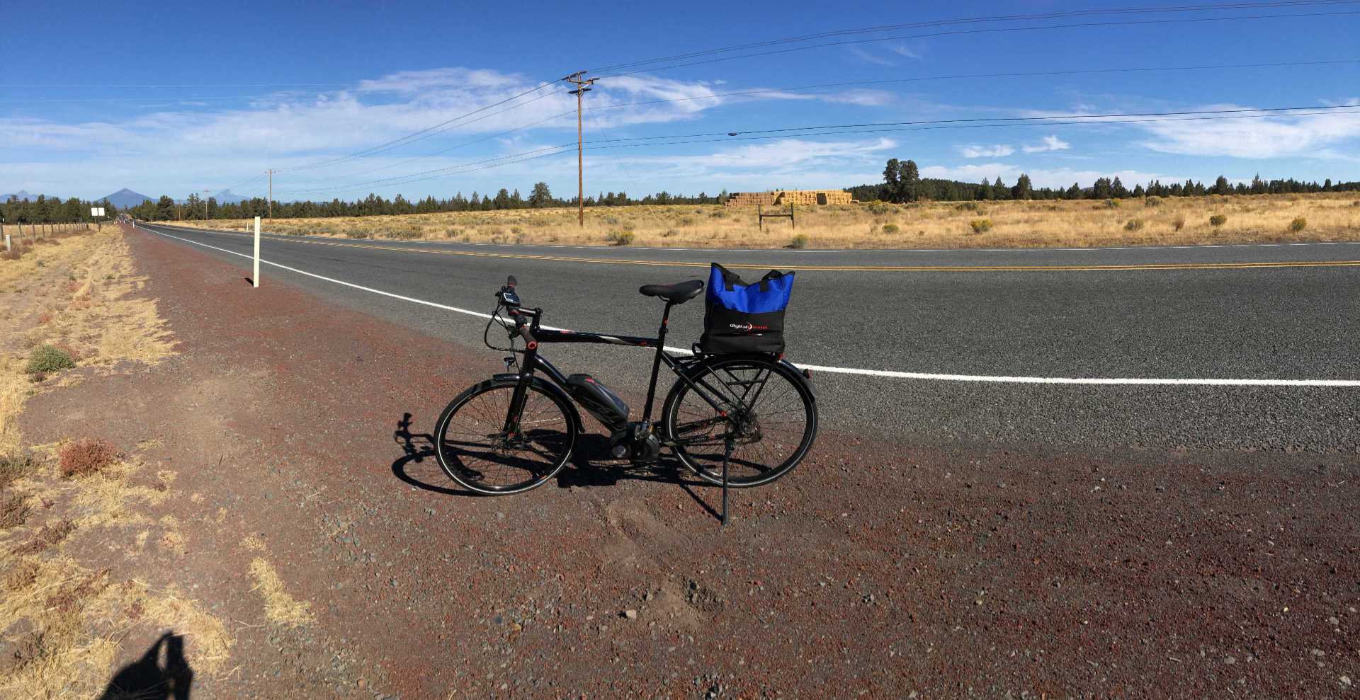 I slipped it into a colleague's trunk to get to Sun River for the company offsite. Then pedaled most of the way to Bend to meet Karen. Sought rescue at the High Desert Museum when my battery ran low. Then on to Sisters the next day with a full charge and new gloves to keep warm.